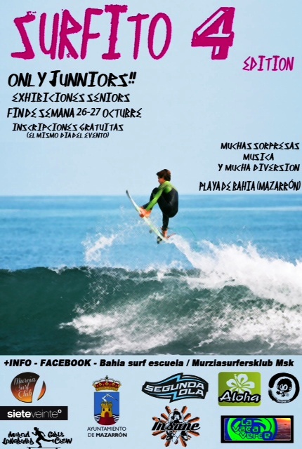 Los próximos días 26 y 27 de octubre se va a celebrar en la playa de La Reya, más conocida como Bahía Grande, la 4ª edición del Surfito, una cita con el surf que organiza la Bahía Surf Escuela y que este año cuenta con la colaboración de la concejalía de Deportes del Ayuntamiento de Mazarrón, además de diversas empresas que aportarán regalos para los participantes de este encuentro.