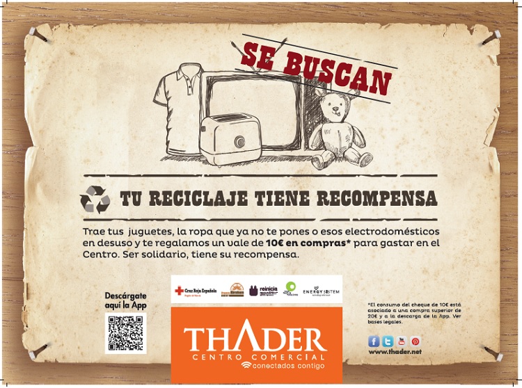 Durante los próximos días los clientes que visiten Centro Comercial Thader y aporten ropa, calzado y juguetes en buen estado, electrodomésticos, pilas y tapones de plástico para reciclar, recibirán un cheque de 10€ en compras en cualquiera de los establecimientos del Centro.