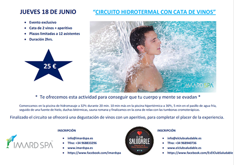 Circuito hidrotermal con cata de vinos y aperitivos en el IMARD SPA, el próximo jueves 18 de junio.