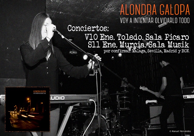 El grupo granadino Alondra Galopa llega a la Sala Musik de Murcia para presentar su segundo disco, a la venta desde el pasado 31 de octubre. El grupo compuesto por Juan A Salinas (guitarra eléctrica y voz), Mónica Navarro (teclados y coros), Alberto Castro (bajo) y Alvaro Blas (batería) tocarán para el público murciano algunos temas de su nuevo disco titulado "Voy a intentar olvidarlo todo" que presenta una marcada tendencia after punk ochentera.