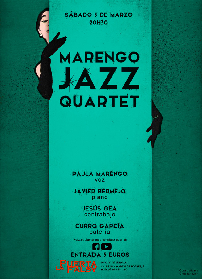 Un cuarteto con un repertorio de Jazz, Jazz fusión, Swing, Bossa, chanson française... Formado por Paula Marengo (Voz), Javier Bermejo (Piano), Jesús Gea (Contrabajo), Curro García (Batería).
