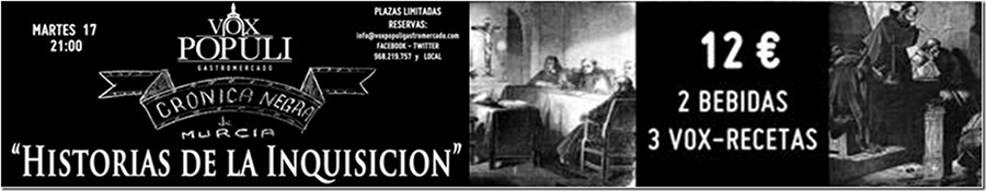 Este Martes 17 de Febrero, nos espera otra de las Crónicas negras de Murcia en Vox Populi Gastromercado, en esta ocasión va dedicada a Historias de la inquisición
