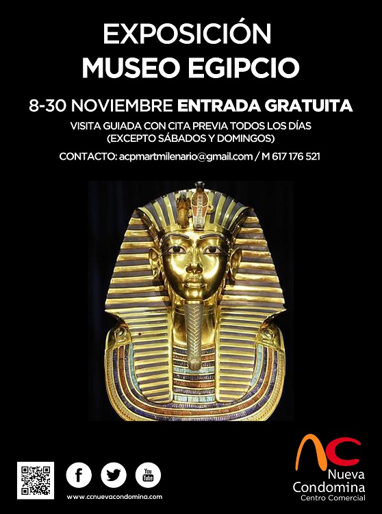 Esta original muestra cultural conseguirá transportar a niños y mayores al imperio faraónico. Los clientes del Centro Comercial Nueva Condomina podrán disfrutar de una completa visita al museo de manera gratuita y, además, aquellos que lo deseen podrán entrar guiados por un experto en egiptología. Para la visita guiada será necesario tener cita previa, que se puede conseguir vía correo electrónico.