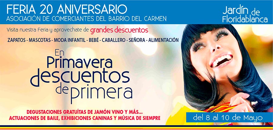Los comerciantes del barrio del Carmen han preparado una Feria 20 aniversario, donde podrás comprar en artículos de zapatería, mascotas, infantil, alimentación... con grandes descuentos. Estará abierta en el Jardín Floridablanca desde el Viernes 8 al Domingo 10 de Mayo.