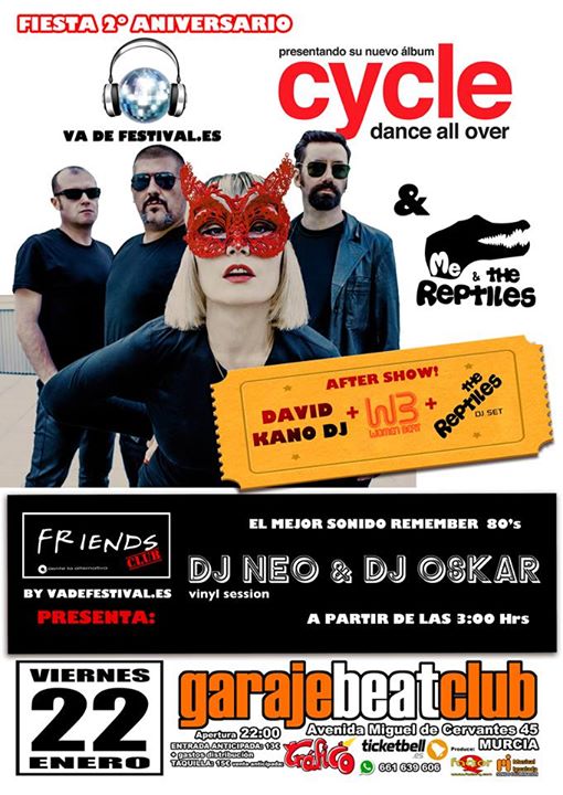 La fiesta comenzará a partir de las 22:00 horas y en ella podremos disfrutar del concierto de Cycle con su formación original. Coincidiendo con su décimo aniversario han lanzado su tercer álbum, "Dance all over", un artefacto de rock bailable con pegada electrónica, bajos y sintetizadores gordos marca David Kano, arreglos y distorsiones de seis cuerdas de Juanjo Reig, la sedosa y provocativa voz de La China Patino y la emocionante voz de Luke Donovan mezcla de rabia, ternura y sadismo.