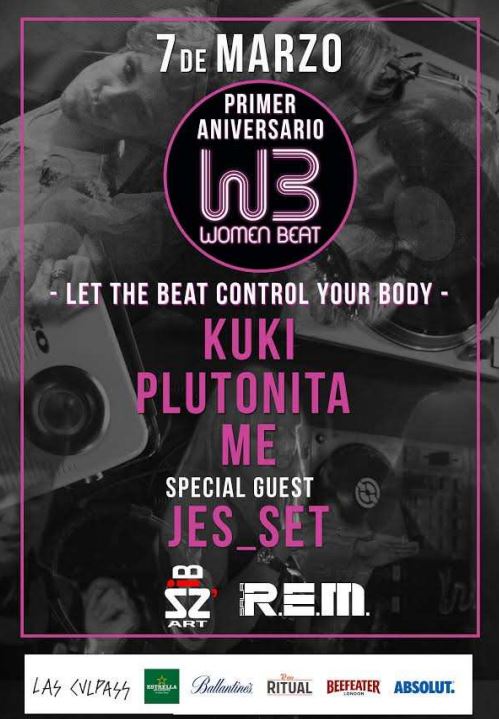 La noche del Aniversario se celebrarán dos fiestas consecutivas en diferentes salas de la ciudad en las que, además de la mejor música a cargo de Women Beat (Plutonita, kuki y ME) y de una invitada de excepción, Jes_Set, habrá espacio para colaboraciones con otros colectivos artísticos y numerosas sorpresas para los asistentes que no dejarán a nadie indiferente.