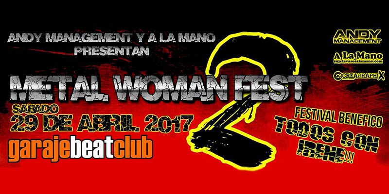 La segunda edición de Metal Woman Fest sigue apostando por las voces femeninas del metal con el objetivo solidario de ayudar a la pequeña Irene, una niña de nueve años que sufre parálisis cerebral severa. Son seis las bandas que participan en este evento benéfico, venidas desde distintos puntos del país. Los malagueños WONDERONCE y los alicantinos ANNYSIA con su fantasy metal, los valencianos SEVENTH HELL con su hard rock, los murcianos KNABULU con su viking metal y la unión de dos bandas THE HELLHATES y MOSCATEL, que da como resultado GLORIA AND THE MAG GANG, una explosiva propuesta de psychobilly. Gran variedad de estilos musicales pero un común denominador, la voz femenina al frente.