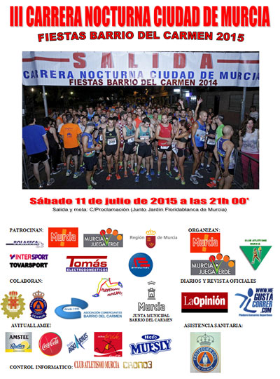 Hasta el 28 de Junio está el plazo abierto para la III Carrera Nocturna Ciudad de Murcia "Fiestas Barrio del Carmen 2015", que se llevará a cabo el 11 de Julio a las 21:00.