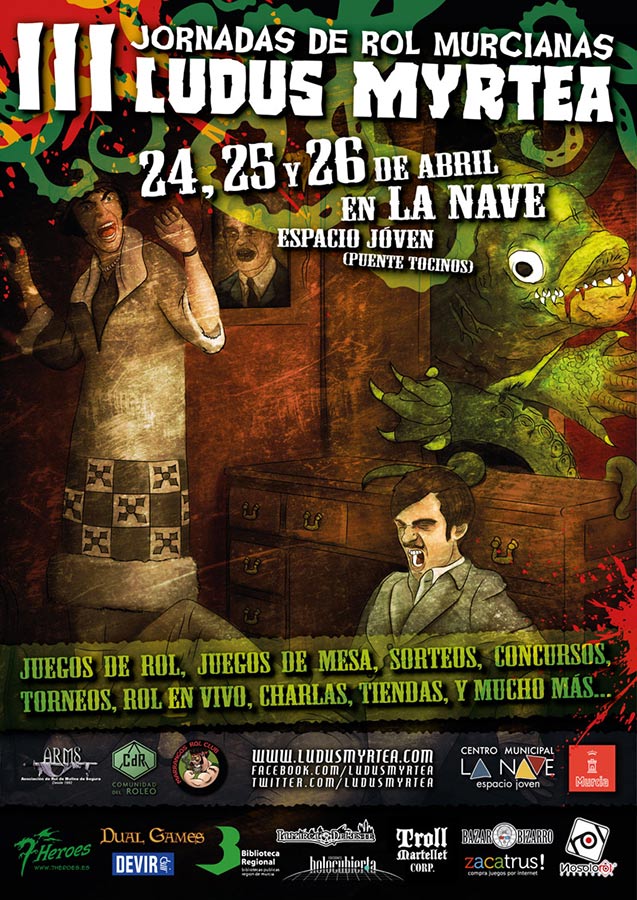 El próximo fin de semana (24 al 26 de abril) tendrán lugar las III Jornadas de Rol Murcianas Ludus Myrtea. Durante tres días tendremos juegos de rol, juegos de tablero, campeonatos, concursos, partidas de rol en vivo, charlas, novedades, sorteos, etc.