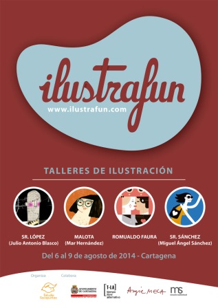La ilustración llega a Cartagena de la mano de Ilustrafun, un proyecto que verá la luz del 6 al 9 de agosto con el objetivo de formarse en este arte. Se trata de 4 cursos impartidos por ilustradores de renombre nacional que se complementan con actividades lúdicas de todo tipo. Estudio Sacapuntas organiza estas jornadas nacionales, junto con la colaboración de la Concejalía de Juventud a través del T-LA (Tiempo Libre Alternativo), Murcia Estudio y Angie Meca.