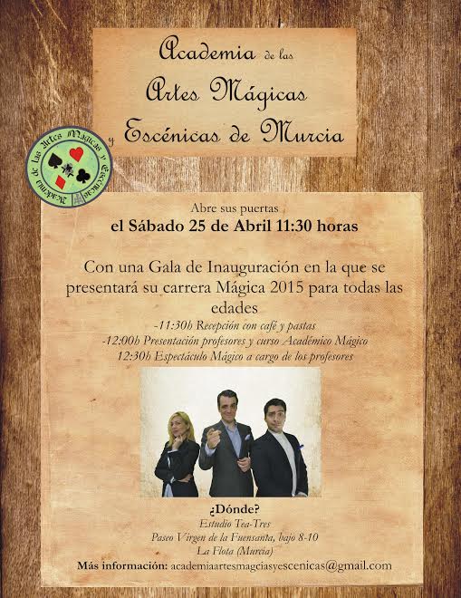 Este sábado 25 de abril a las 11:30 horas se inaugura la primera “Academia de las Artes Mágicas y Escénicas de Murcia” en el Paseo Virgen de la Fuensanta, Bajo 8-10, La Flota, Murcia.
