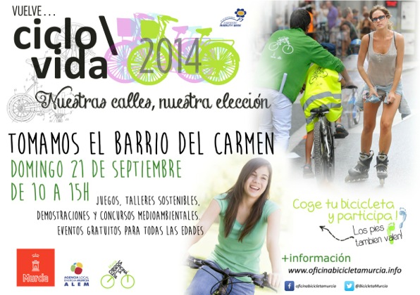Mañana, domingo 21 de septiembre, desde las 10:00 y hasta las 15:00, las bicicletas toman las calles de Murcia, concretamente el Barrio del Carmen, a lo largo de la Alameda de Colón y toda la calle Floridablanca, convirtiéndolo en un itinerario verde cortado al tráfico, para poder caminar y disfrutar, reservado a bicicletas, patines y amantes de la movilidad sostenible.