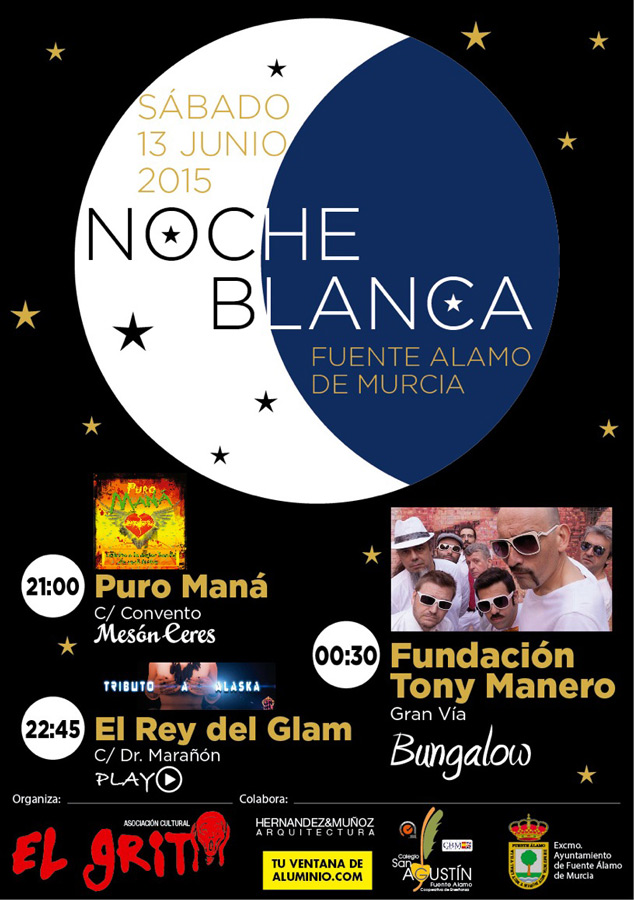 Este Sábado 13 de Junio se celebra en Fuente Álamo la "Noche Blanca 2015" con varias actuaciones musicales gratuitas repartidas por toda la localidad.