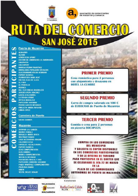 La Asociación de Comerciantes de Mazarrón y Comarca (ACOMA) colaboran con las Fiestas de San José y organizan su Ruta del Comercio. En total son 44 comercios los que participan. Comprando en seis comercios distintos los clientes podrán rellenar un boleto que les dará derecho a optar a tres premios: una cena romántica más alojamiento en el Hotel La Cumbre, un carro de compra valorado en 100 euros en Eurocash El Puerto y una comida o cena para dos en Bocapizza.