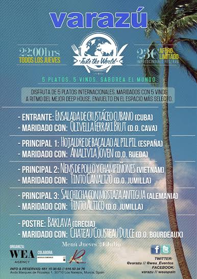 Este Jueves 24 Varazu Bar (Los Narejos) y la empresa de eventos WEA, nos presentan "Saborea el mundo": cena maridaje de 5 platos internacionales y 5 vinos con sesión Deep House en directo disfrutando sentados en su espectacular terraza del fresquito de las noches de verano. Placer para los 5 sentidos.
