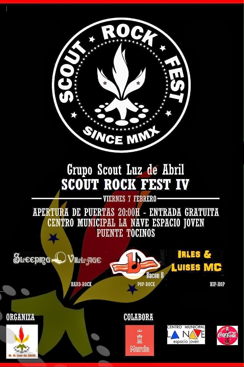 La IV Edición del Scout Rock Fest tendrá lugar el viernes 7 de Febrero, a partir de las 20:00 hrs, en el Centro Municipal La Nave Espacio Joven de Puente Tocinos y contará con los grupos Bacon B (pop-rock), Irles & Luises Mc (hip-hop) y Sleeping Village (hard-rock).