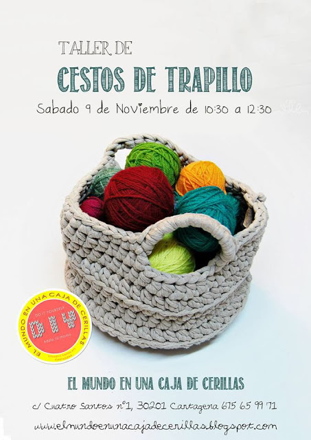 Tras el éxito de este taller en junio, El Mundo en una Caja de Cerillas (C/ Cuatro Santos nº1, Bajo izqda. 30202) vuelve a la carga de nuevo para enseñarnos a relizar un precioso cesto de trapillo.
