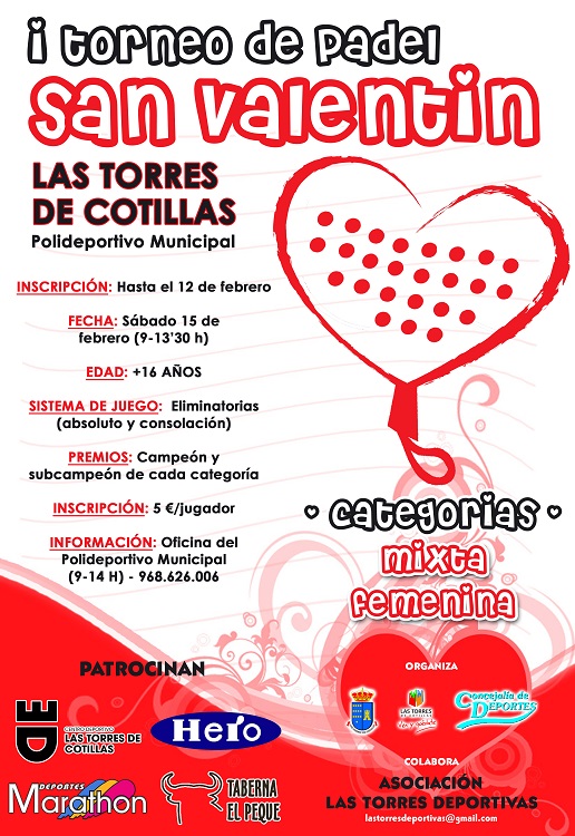 La Concejalía de Deportes de Las Torres de Cotillas, en colaboración con la “Asociación Las Torres Deportivas” del municipio, ha organizado para el próximo sábado 15 de febrero (de 9 a 13:30 horas) el torneo de pádel “San Valentín 2014”. Propuesto tanto para parejas mixtas como femeninas, se celebrará en las pistas de pádel del Polideportivo Municipal mediante el sistema de juego de fases eliminatorias de cuyos primeros partidos saldrán dos categorías: absoluto y consolación.