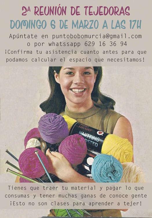 Con la intención de retomar las antiguas reuniones en las que se hablaba y compartía experiencias en torno a unos ovillos de lana y unas agujas de tejer, y tras el éxito de la primera quedada, Punto Bobo está organizando para este domingo 6 de marzo, a las 17:00 horas, la 2ª Reunión de Tejedoras en Murcia.