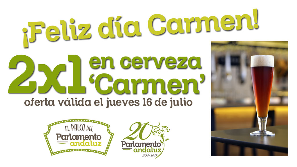 Y para estrenar que ayer publicamos la crítica de "El Palco del Parlamento" y que hoy es el día de Carmen, ¡¡FELICIDADES A TODAS LAS CARMEN!!, nos traen una oferta de 2X1 en su cerveza 'Carmen'.