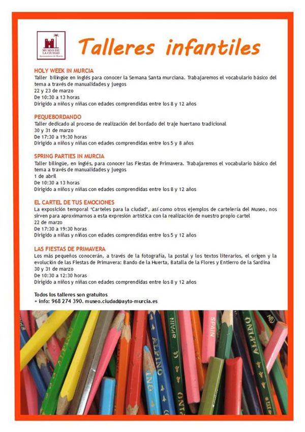 El Museo de la Ciudad de Murcia (Plaza Agustinas, 7) nos propone diversas actividades infantiles para estas fiestas de Semana Santa y Primavera. Los más pequeños de la casa disfrutarán de talleres y visitas gratuitas relacionadas con la cultura de nuestra región durante estos días de vacaciones.
