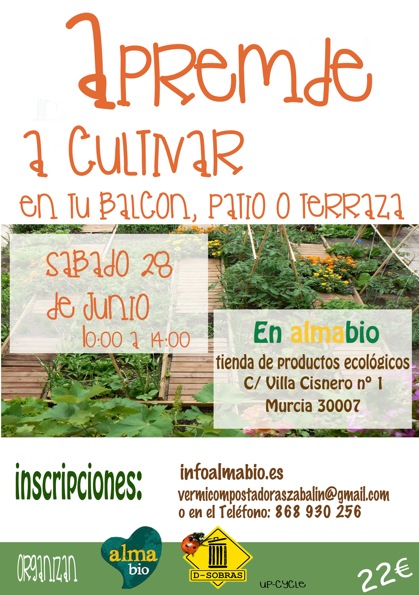 El taller será el Sábado 28 de Junio de 10:00 a 14:00 en la tienda de productos ecológicos "En almabio" (C/ Villa Cisnero nº 1, Murcia)