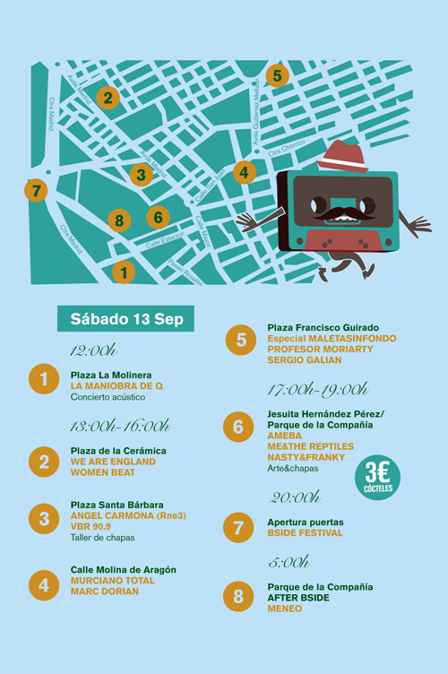 El sábado 13 de septiembre, a las 12:00 comenzamos en Plaza la Molinera, con un concierto acústico de La Maniobra de Q. Una hora más tarde y hasta las 16:00 deberemos recorrernos los locales de Plaza de la Cerámica, Plaza Santa Bárbara, Calle Molina de Aragón y Plaza Francisco Guirado, con los conciertos de We are england y Women beat; Angel Carmona y VBR 90.9; Murciano total y Marc Dorian; MaletaSinFondo (especial), Profesor Moriarty y Sergio Galian; respectivamente.