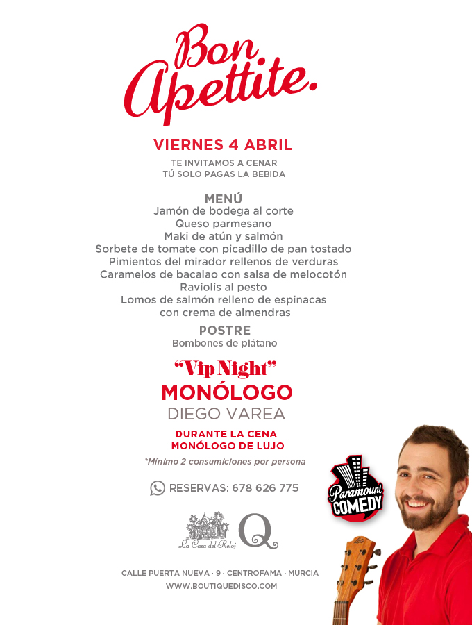 Bon Apettite en Boutique Murcia: cena amenizada con los monólogos de Diego Varela.