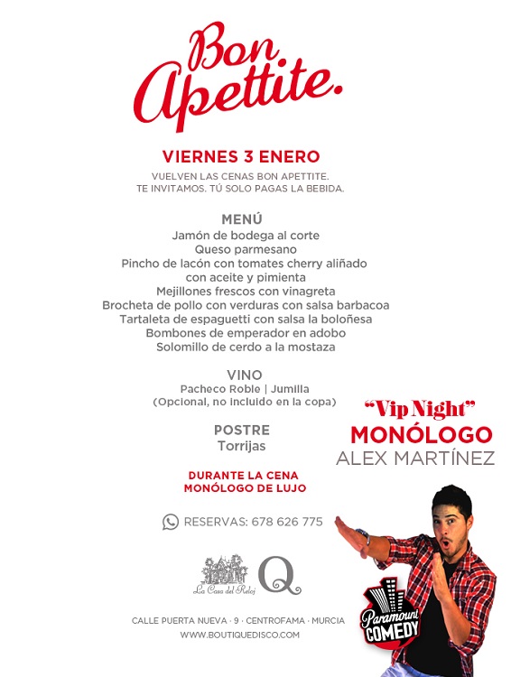 Este jueves 3 de enero, vuelven las cenas Bon Apettite a la Discoteca Boutique. Pagando sólo la bebida, Boutique te invita a una cena de nivel con el siguiente menú: