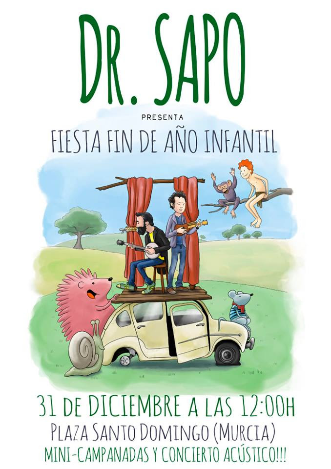 Dr. Sapo y Fernando Polaino estarán en la Plaza Santo Domingo el día 31 a las 12 de la mañana para dar las campanadas de la Nochevieja infantil de Murcia y actuar en directo, presentando así por primera vez en Murcia su Audio-cuento, Las Aventuras de Sam, sin demasiadas parafernalias, solo las canciones y el carisma de estos dos artistas.