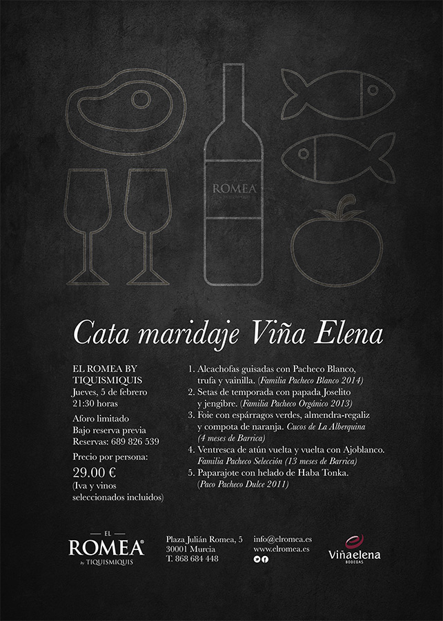 El Jueves 5 de Febrero a las 21:30, los aficionados al vino tendrán la oportunidad de hacer una cata Maridaje de las bodegas Viña Elena. Y además poder disfrutar de lo último de "Tiquismiquis", su local ubicado en "El Romea" (Plaza Julián Romea, 5)