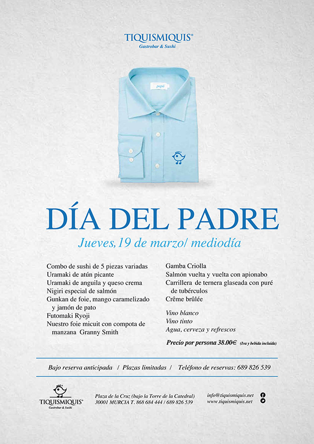 Reserva ya tu mesa para disfrutar de una comida por el día del padre 2015 el Jueves 19 de Marzo en Tiquismiquis Gastrobar y Sushi. Seguro acertarás con su menú: