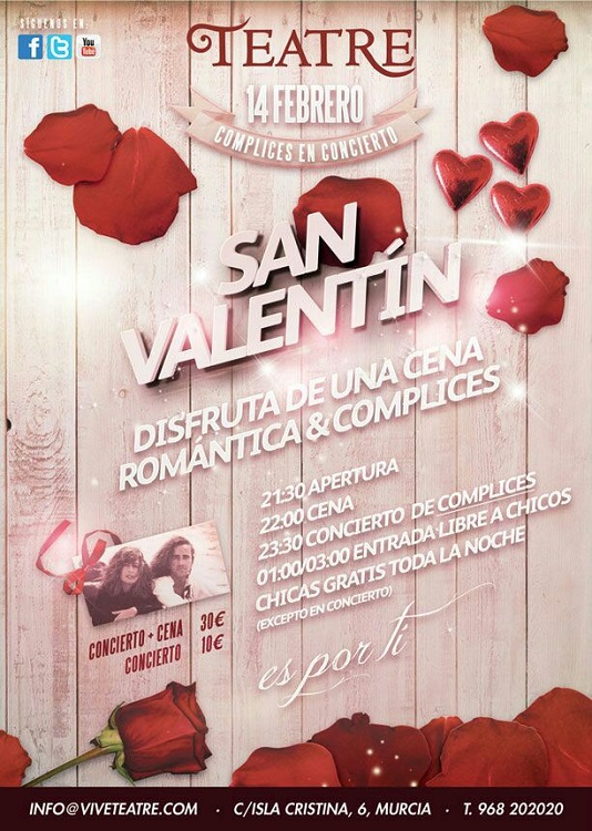 Celebra San Valentín de forma especial, acudiendo a la cena organizada por Teatre y al posterior concierto de Cómplices. A las 22:00 horas comenzará la cena con el menú "Un cuento de amor":