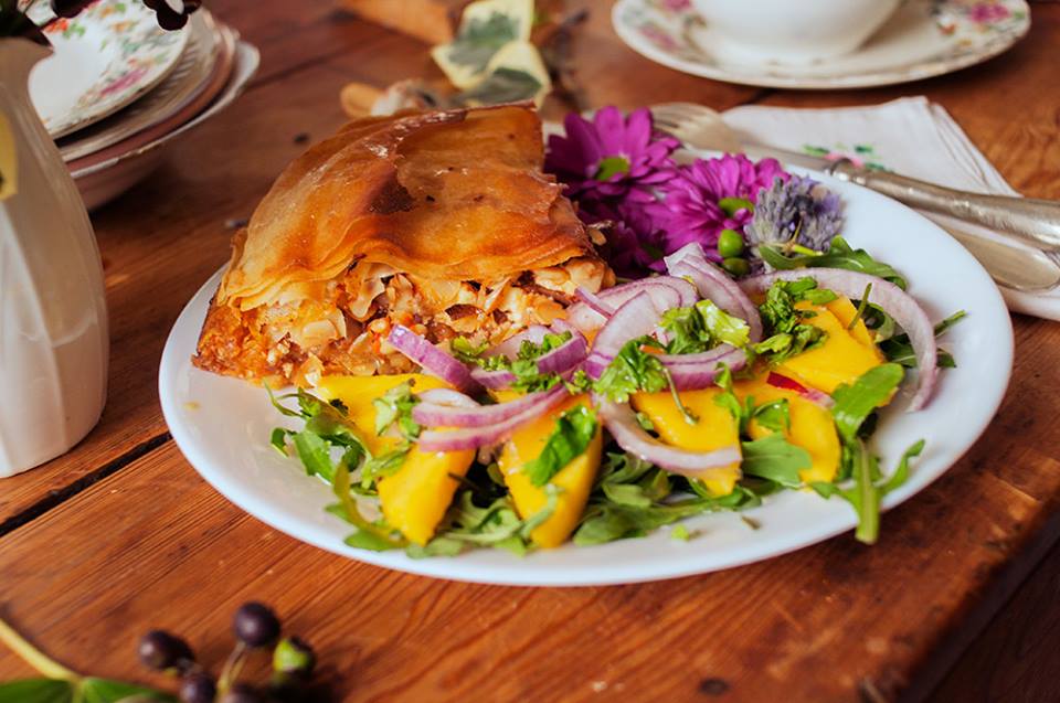 - - Baklava de tomate, feta, almendras y dátiles, acompañado de una ensalada de mango