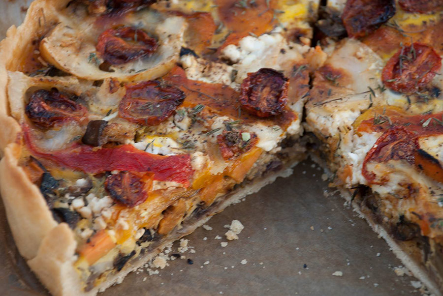 - Tarta de verduras asadas con tomillo y ricotta acompañada de ensalada de tomate, alcachofas marinadas caseras y aceite de ajo asado.