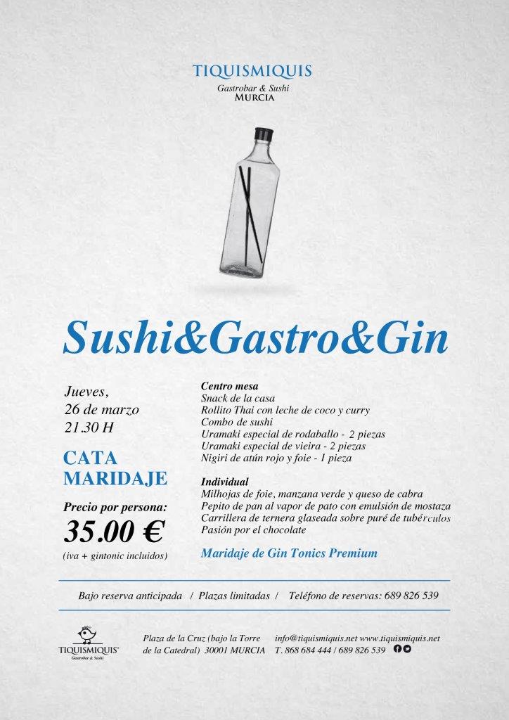 Este Jueves 26 de Marzo a las 21:30 tienes que ir "Tiquismiquis Gastrobar & Sushi" para hacer una cata maridaje de Gin Tonics Premium con los siguientes platos: