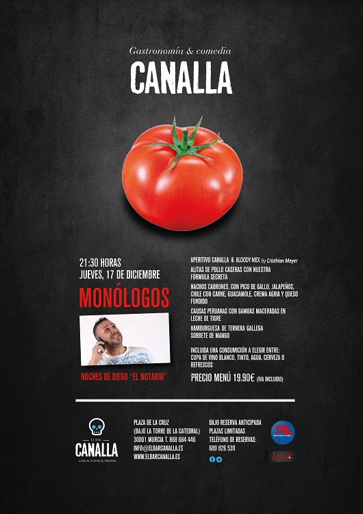 Este jueves 17 de diciembre podremos disfrutar de una noche de risas acompañada de una cena deliciosa en El Bar Canalla. Las risas estarán a cargo del cómico Diego "El Notario" y la cena estará compuesta por:
