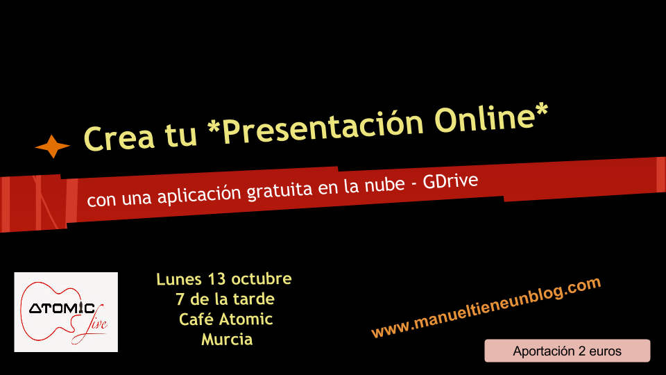 El próximo lunes 13 de octubre, a las 19:00 se dará una charla "Iniciación Crea tu Presentación Online, usando herramientas gratuitas (GDrive)" en el Café Atomic, dirigido a personas que quieran aprender a crear una presentación para compartirla en su web, blog o a través de las redes sociales, ya sea para uso personal, uso educativo, crear un albúm online de fotos... Nivel básico, de iniciación.