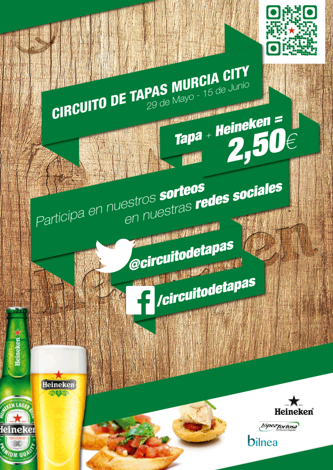 Heineken patrocina una de las ruta de las tapas mas groumet de la Región. Repartido por 54 locales dentro de 4 zonas divididas por toda la ciudad Murciana nos vamos a encontrar grandes tapas y siempre acompañado de una fria cerveza.