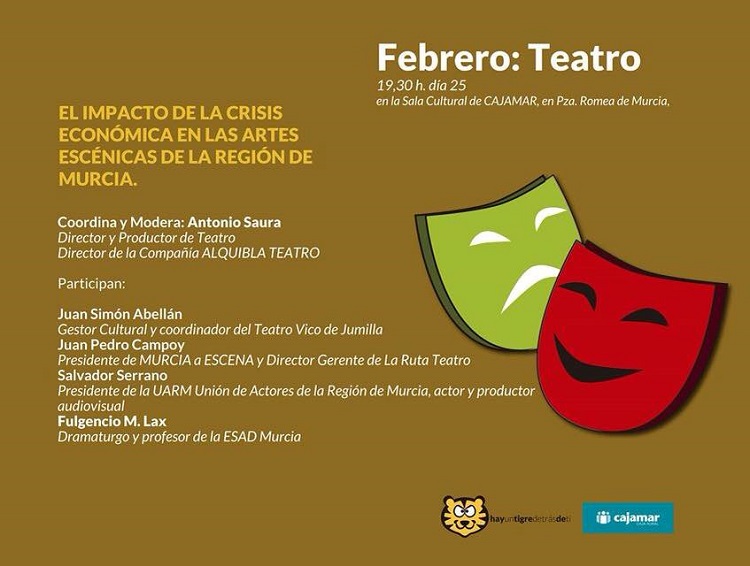 Hoy jueves 25 de febrero, tendrá lugar en la Sala Cultural de Cajamar (Plaza Romea de Murcia), el coloquio titulado "El impacto de la crisis económica en las artes escénicas de la Región de Murcia", coordinado y mederado por Antonio Saura, director y productor de teatro y director de la Compañía Alquibla Teatro.