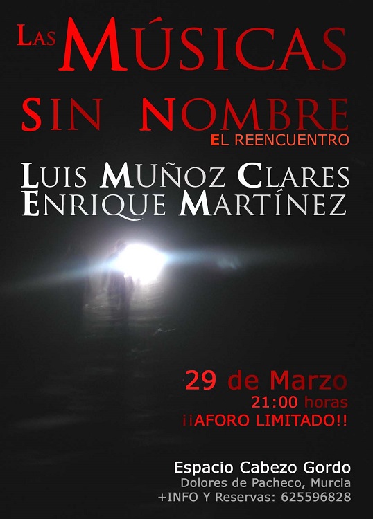Este concierto, que tendrá lugar el sábado 29 de marzo a las 21:00 horas, será el reencuentro de dos grandes amigos y músicos, Luis Muñoz Clares y Enrique Martínez. Aprovechando el marco incomparable que supone tocar en Espacio Cabezo Gordo, en Dolores de Pacheco, estrenarán su nuevo proyecto musical, "Las Músicas sin Nombre".