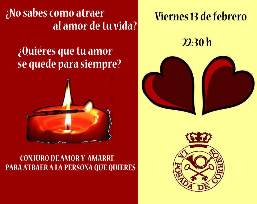 Este viernes 13 de Febrero a las 22:30, con motivo de la celebración de San Valentín, en La Posada de Correos, tendreis a una vidente que nos hará un conjuro especial de amor para atraer o mantener a esa persona amada...