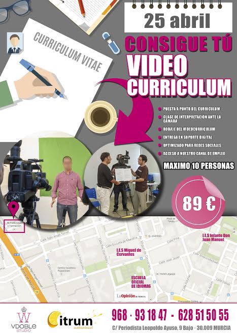 El curso incluye: puesta punto del currículum, clases de interpretación ante la cámara, rodaje del videocurrículum, entrega del mismo en soporte digital, optimizado para redes sociales y acceso a su canal de empleo.