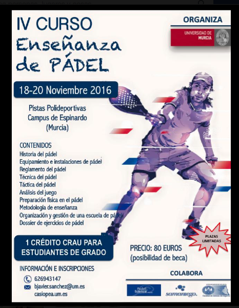 Después del éxito de las anteriores ediciones, la Universidad de Murcia organiza la IV Edicción del Curso de Enseñanza de Pádel que tendrá lugar en las pistas polideportivas del Campus de Espinardo de Murcia, los días 18, 19 y 20 de noviembre. Además, para los estudiantes de la Universidad de Murcia el curso supone el reconocimiento de 4 créditos ECTS o 1 crédito CRAU.