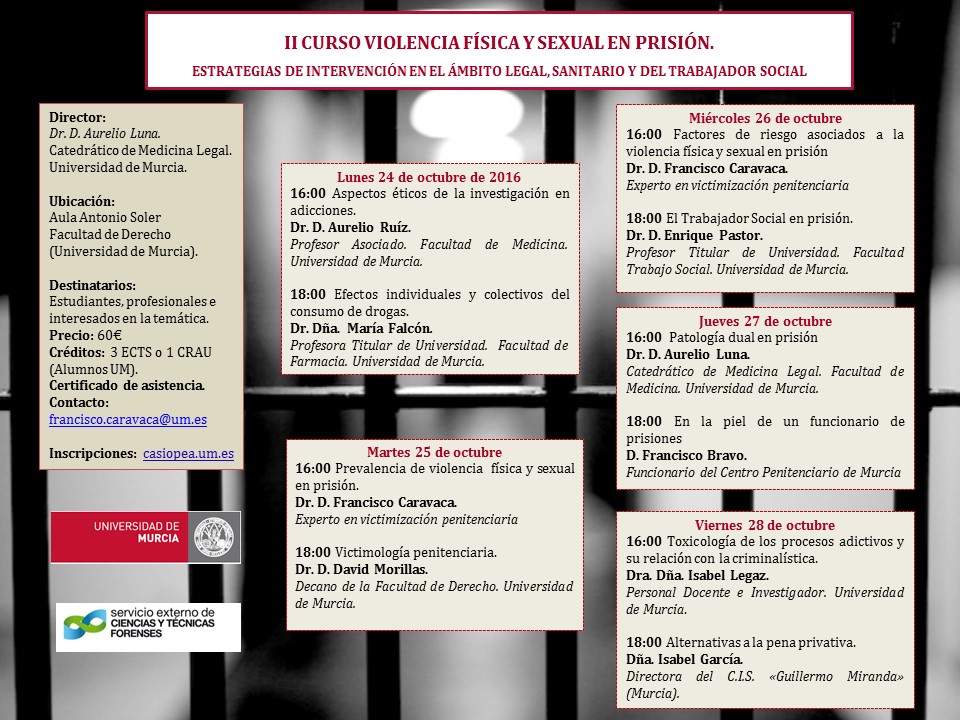 Después del éxito de la I edición, la Universidad de Murcia organiza la II edicción del curso titulado "Violencia física y sexual en prisión. Estrategias de intervención en el ámbito legal, sanitario y del Trabajador Social" que tendrá lugar en la Facultad de Derecho durante la semana del 24 al 28 de octubre en horario de tarde. Además, para los estudiantes de la Universidad de Murcia el curso supone el reconocimiento de créditos ECTS o 1 crédito CRAU.