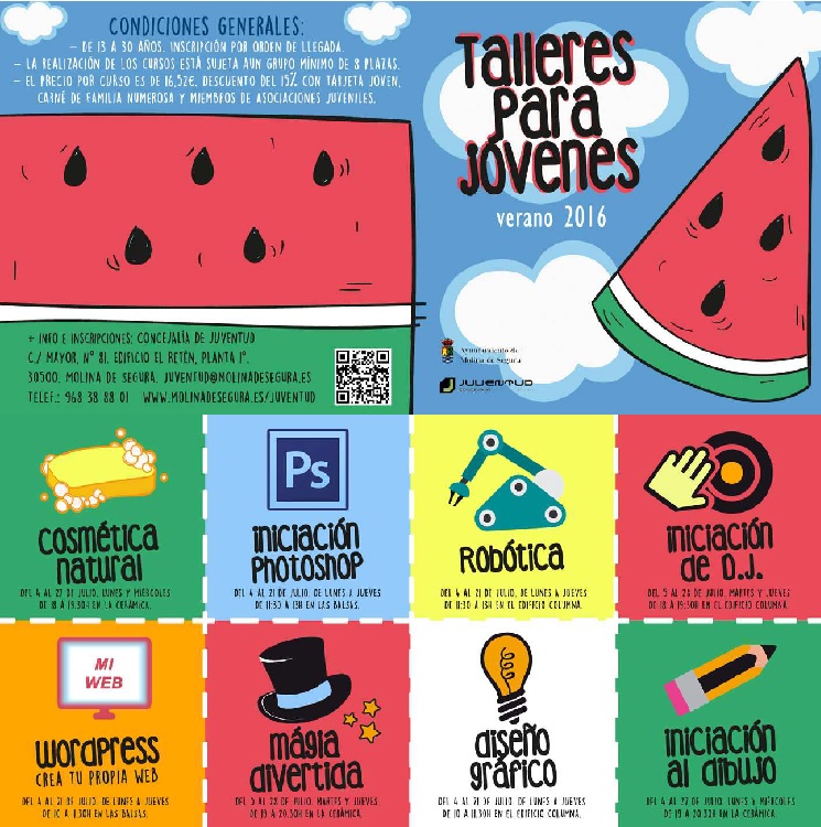 La Concejalía de Juventud de Molina de Segura ha creado una oferta de cursos de verano dirigidos al público joven del municipio, de los 13 a los 30 años. Entre los diversos talleres podemos encontrar talleres de robótica, wordpress, diseño gráfico, dibujo, cosmética natural, D.j. photoshop, etc.