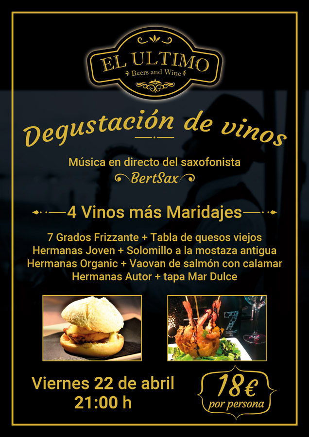 Música al Vino es una cita con el vino, el maridaje gourmet y la música en directo. La noche de la cata estará acompañada por la actuación en directo del saxofonista Bertsax. Vente este Viernes 22 de Abril a 'El Último Beer & Wine' y disfruta.