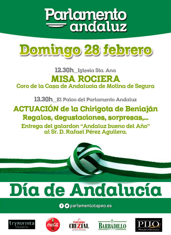 Un año más el día de Andalucía se sentirá en Murcia. El restaurante murciano, el Parlamento Andaluz y en el Palco del Parlamento, cuya especialidad son las tapas andaluzas, realiza cada año un gran evento con motivo del día grande de la comunidad autónoma. Frente a este local, en la Plaza del Romea de Murcia, el Domingo 28 de febrero, Pepe Rubiales, propietario y fundador del bar murciano, dará el pistoletazo de salida al programa para celebrar el día de Andalucía sobre las 12:30 horas.