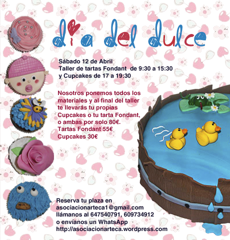 Para realizar tu reserva en el taller solo tienes que enviar un correo a: asociacionarteca1@gmail.com, indicando tus datos, teléfono móvil, y correo, añadiendo el nombre del taller al que se desea asistir y abonar el 50% mediante transferencia bancaria 10 días antes al taller, disfrutarás de tu taller y tendrás tu Tarta Fondant o tus CupCakes o ambas por solo 80€.