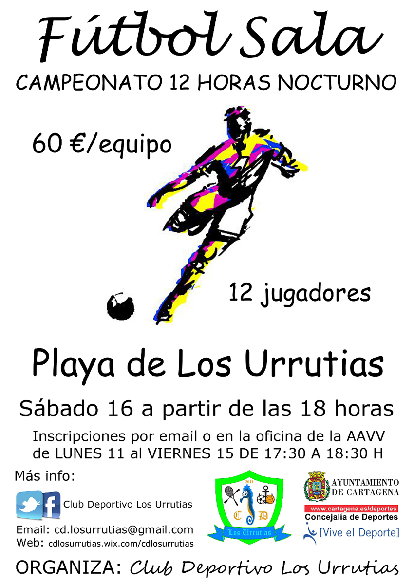 El Club Deportivo Los Urrutias, con la colaboración de la Concejalía de Deportes del Ayuntamiento de Cartagena, ha organizado un verano más el Torneo 12 horas de fútbol sala, que en esta edición se celebrará en su mayor parte por la noche.